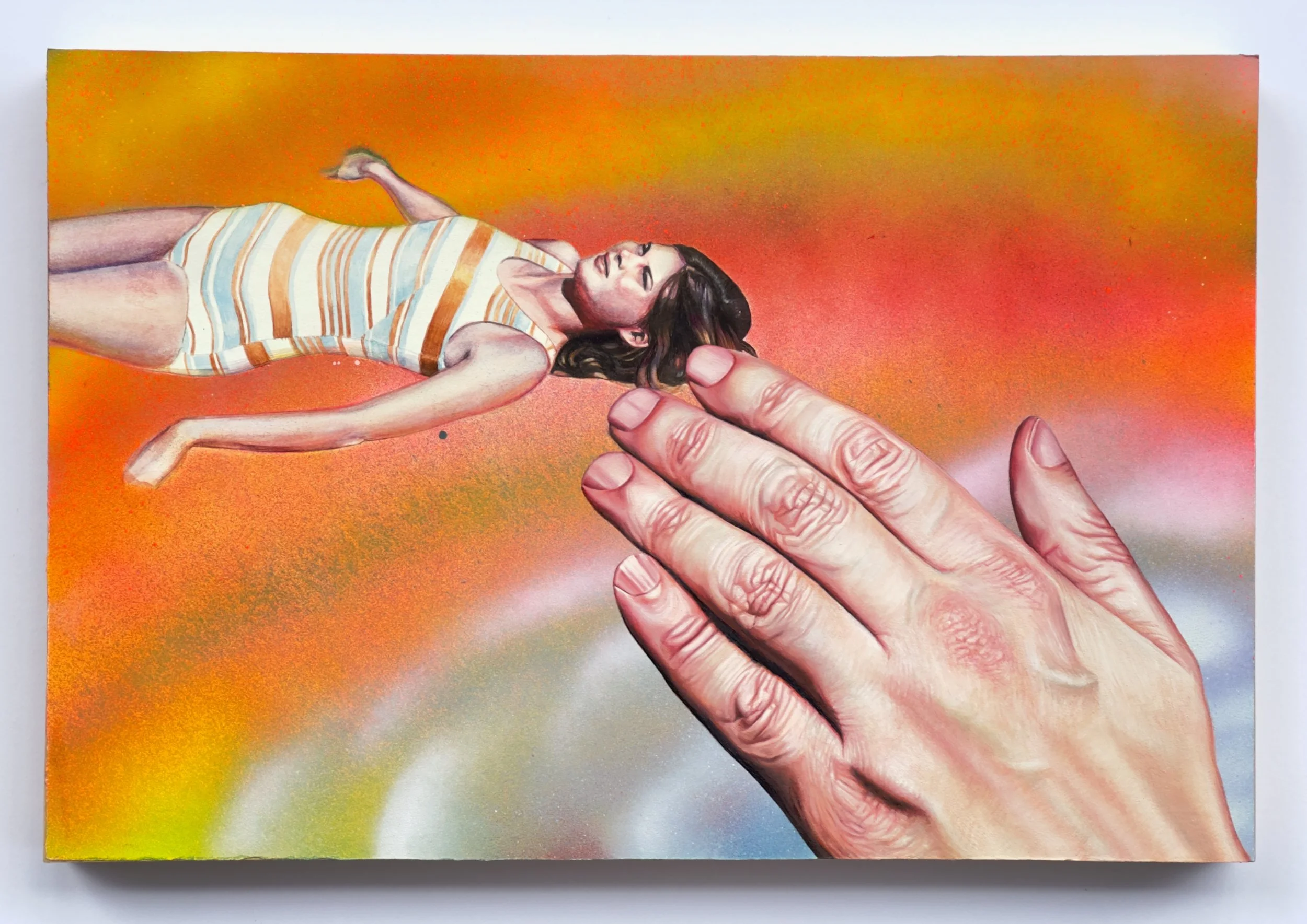 This spray paint and oil painting addresses the Mormon concept of "Choosing the Right" or “CTR.” Dogma pervades within Mormonism and there is always considered to be a “right and wrong to every question.” This emphasis on black and white perfectionism leads to a judgmental and self-loathing culture, emphasized by the excessive rings and strained flesh of the grasping fingers in this painting.